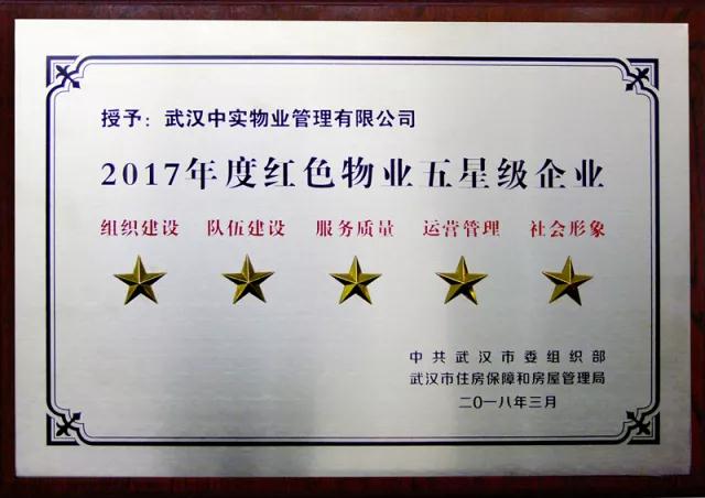 3月19日,在全市“红色物业五星级企业”命名表彰暨“红色引擎工程”拓面提质推进会上,江汉区房地产公司旗下的武汉中实物业有限管理公司作为公益性物业服务企业代表(以下简称“中实物业”),被授予2017年度“红色物业五星级企业”荣誉称号。