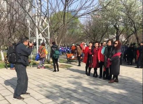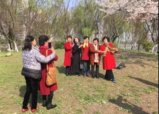 在温暖的夕阳下、美丽的樱花背景中,志愿者们为老人们拍照留念,记录他们灿烂的笑容,也记录下了西北湖的别样美丽。