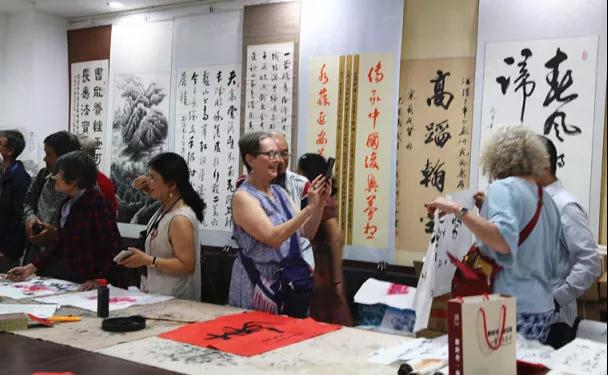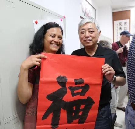 书画课堂上,学员们将自己的书画作品赠送给美国朋友们,来自美国的马拉迪激动地说:我要把它带回家,然后装裱起来。欢迎送给我礼物的程汉唐先生来我家做客!