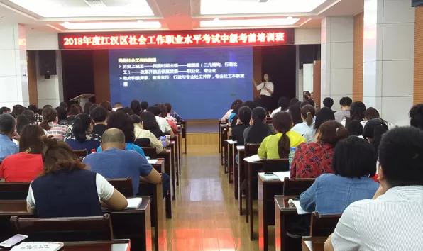 为加强江汉区社会工作专业人才队伍建设,加速推进江汉区社区工作者向专业社会工作者的转化,5月4日起,江汉区民政局组织全区140名报考全国社会工作师(中级)和610名报考全国助理社会工作师(初级)的社区工作者,进行2018年度考前培训。