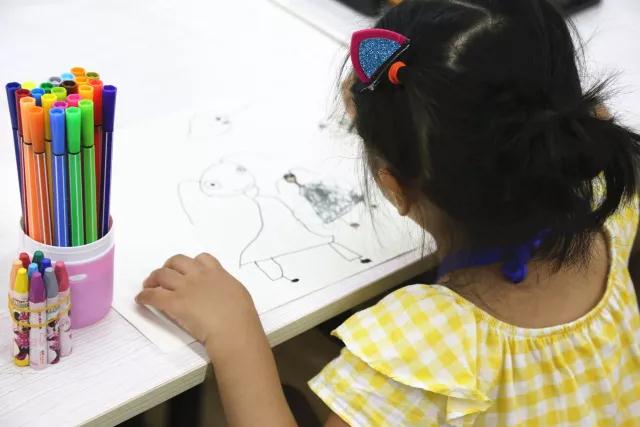 一手扶住画纸,一手握着彩笔,这个正在一丝不苟作画的小朋友,名叫刘熙昱,她是比赛现场年纪最小的选手,年仅4岁。