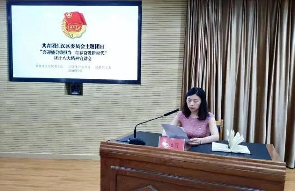 为切实把团十八大精神学习好、领会好、宣传好、贯彻好,引导广大团员青年将学习成果转化为推动本职工作的强劲动力,7月4日下午,共青团江汉区委员会联合江汉区公安分局、民意街工委举办主题团日活动,以“喜迎盛会勇担当 青春奋进新时代”为主题开展学习团十八大精神宣讲会。