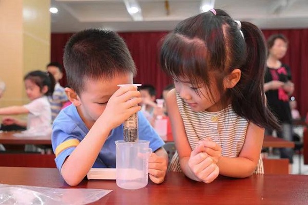 在童老师的带领下,孩子们两人一组自己动手做实验,学习如何检测水质,以及自制净水器、探索净水器的科学原理。