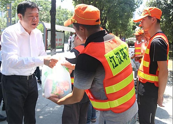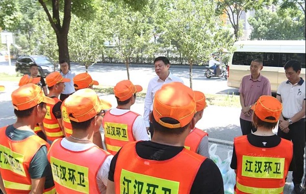 李湛向环卫工人送上了酸梅膏、毛巾、绿豆、白砂糖等防暑降温物品,详细了解了夏季环卫作业重难点、劳动强度和职工身体状况等情况,对环卫工人们顶烈日、战高温、保清洁表示衷心感谢,对他们为美化江汉市容环境作出的贡献致以崇高敬意。