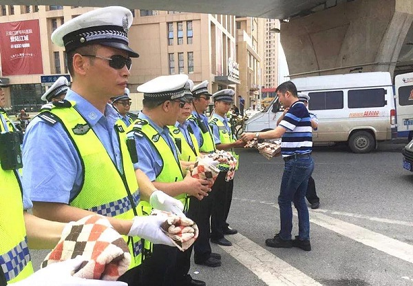7月24日上午,汉兴街慰问了在高温下坚守岗位的交警,为他们送去10箱矿泉水、50条毛巾等降温物资。