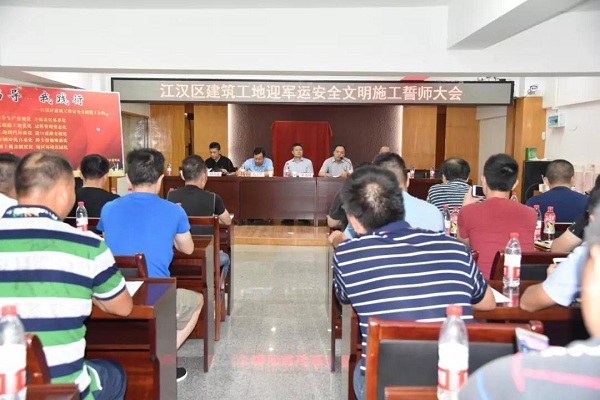 7月27日上午,区建设局、区建管站组织召开了江汉区建筑工地迎军运安全文明施工誓师大会,吹响了江汉区建筑工地环境整治提升战役的号角。辖区各参建单位将提高站位、提升标准、加大投入、落实责任,下大力气对建筑工地环境进行整治提升,努力打造“精致江汉”,为军运会成功举办提供高品质的环境保障。