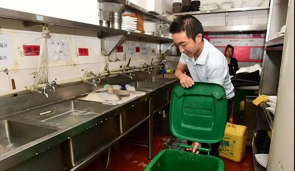 在国广6楼一家餐馆,一进厨房,就可以看见侧边摆放着2个120升的餐厨垃圾桶,洗碗台下面还摆着2个60升的餐厨桶,这都是由负责收运的企业免费提供的,桶上还有电子标签,每桶餐厨垃圾的来源和去向,都可查到。