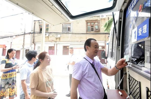 上午10点, 流动车管所一进社区,地质社区的居民立刻就围了过来。居民丁先生要办理换新证业务,他将早已准备好的相关材料拿在手中,等着复印证件、拍照、体检、填写《机动车驾驶证申请表》,8分钟后,一张新驾照就到手了。他高兴地说,这次活动是实实在在为老百姓办实事,可以让市民足不出户就能办理车管业务。
