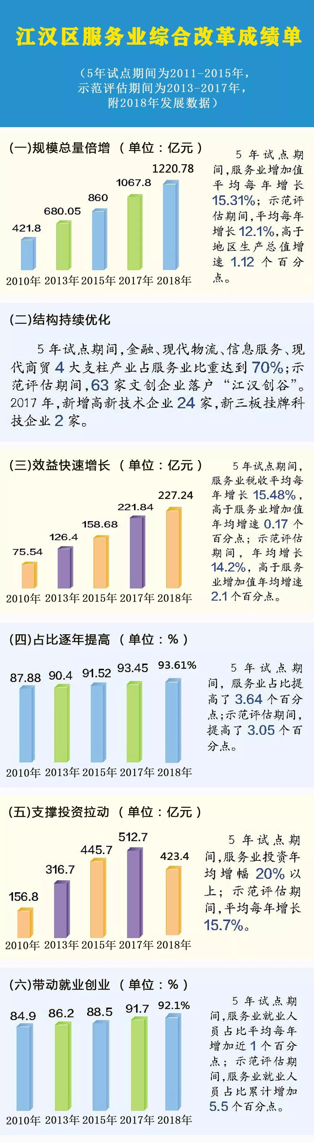 从最开始“国家服务业综合改革试点区”到现在的“国家服务业综合改革示范典型”,江汉区在服务业创新上不断书写新篇章。
