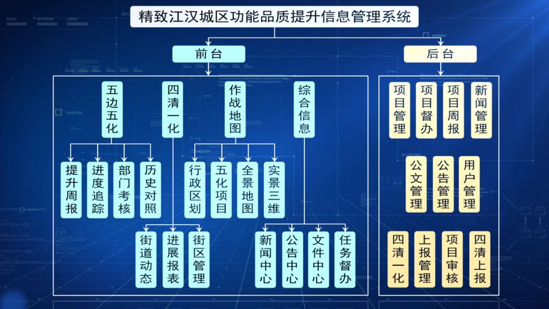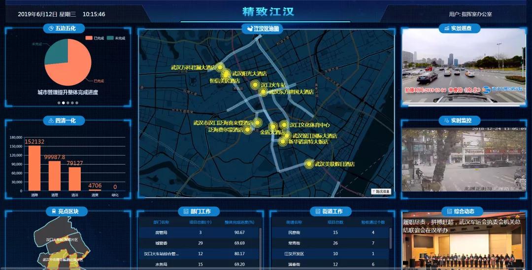 2018年10月,“精致江汉城区功能品质提升信息管理系统”(简称“一张图”)投入使用。系统运用大数据、互联网等技术,建立了“五边五化”、“四清一化”、“作战地图”、“综合信息”四大版块,通过后台数据的实时更新,实现了对全区军运会各项筹办任务的信息化、空间化、可视化管理。