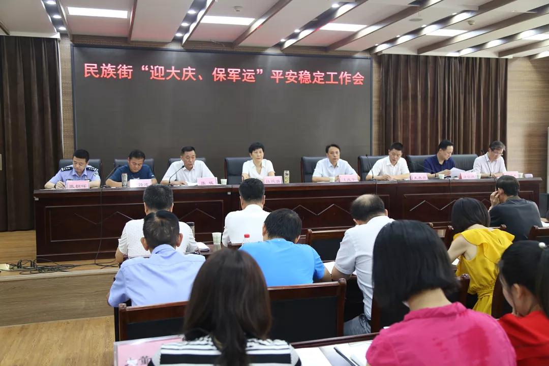 9月2日上午,民族街召开工委扩大会,部署“迎大庆、保军运”平安稳定各项工作,成立工作指挥部,按照“一部两室六组”架构运作,确保重要时期辖区平安稳定,坚决打赢平安稳定攻坚战。工委扩大会后,组织召开全街“迎大庆、保军运”平安稳定工作会议,布置了相关工作方案。