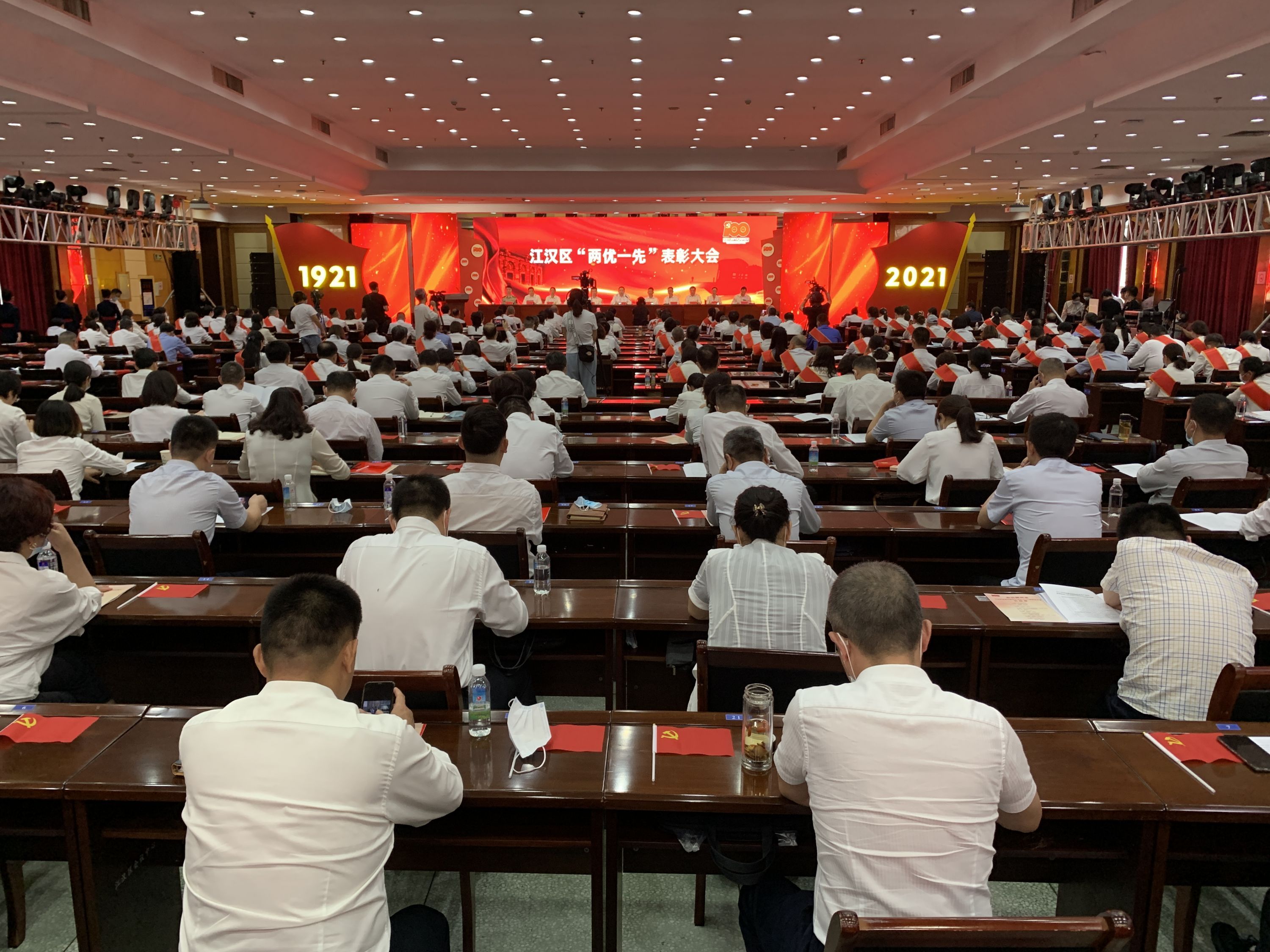 6月28日下午,江汉区机关5楼大礼堂内掌声经久不息,来自全区各条战线的300名优秀共产党员、优秀党务工作者及先进基层党组织书记代表胸戴党徽、肩披绶带,光荣参加全区“两优一先”表彰大会。