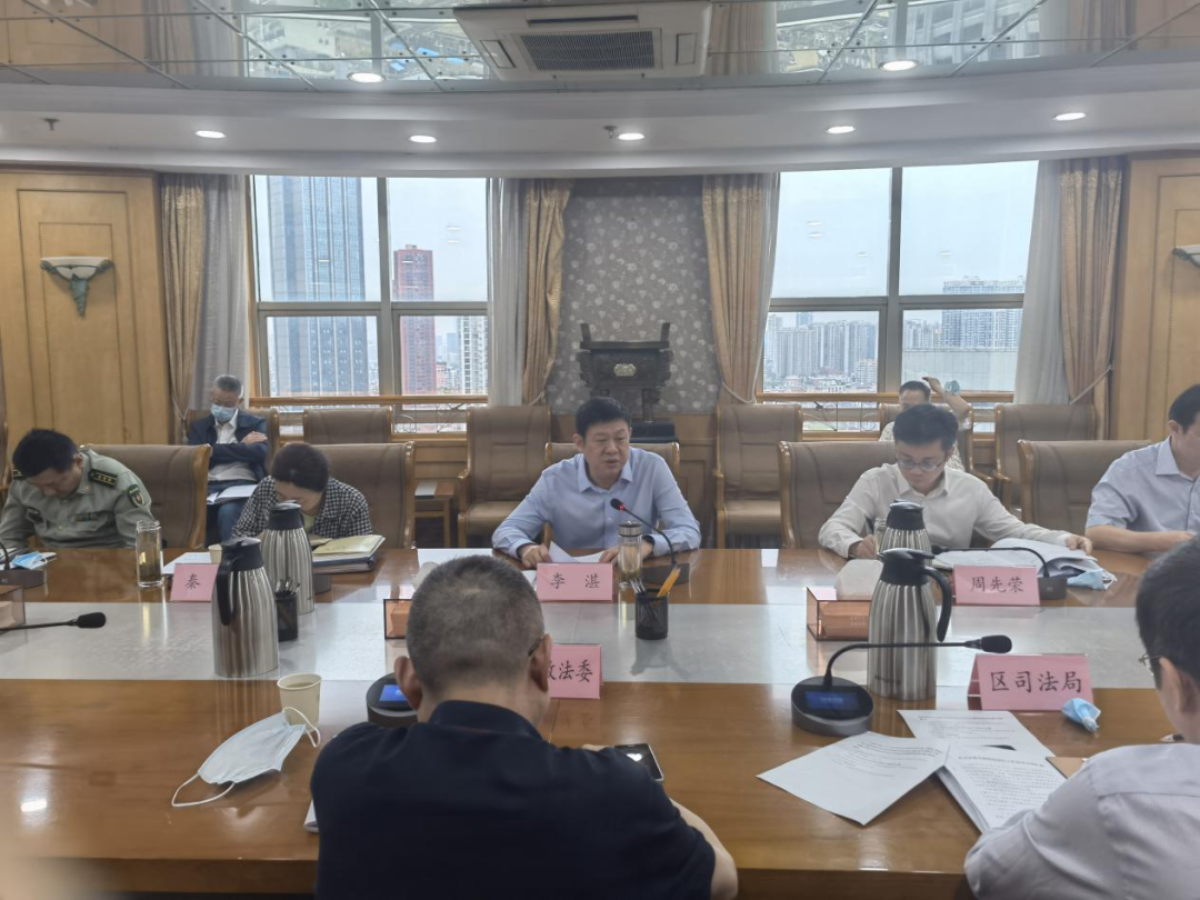 4月27日,十三届江汉区委全面依法治区委员会第一次会议召开。区委书记、区委全面依法治区委员会主任李湛主持会议并强调,要深入学习贯彻习近平法治思想,紧紧围绕区第十三次党代会提出的“领跑新赛道、展现新图景,建设富裕活力美丽幸福的社会主义现代化卓越城区”的奋斗目标,更好发挥法治的引领、规范和保障作用。全区上下要深入学习贯彻习近平法治思想,牢牢坚持“两个确立”、自觉做到“两个维护”,坚持不懈用习近平法治思想武装头脑、指导实践、推动工作,提高运用法治思维和法治手段发现问题、分析问题、解决问题的能力水平,全面提升法治江汉建设水平。