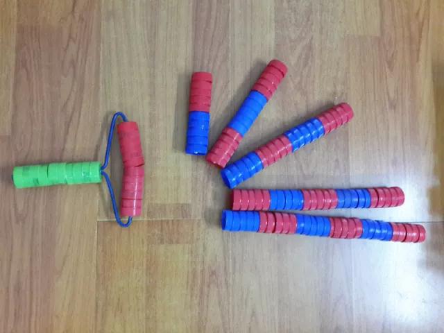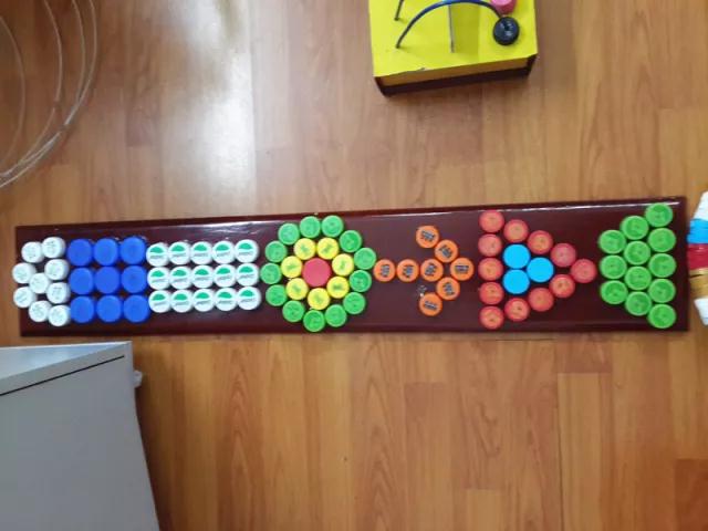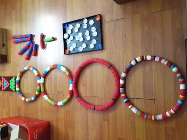 有一天,她在幼儿园巡查的时候,看到小朋友将喝过的饮料瓶扔进垃圾桶,她一拍脑门:“这不就是我们需要的材料吗?瓶盖不仅易于收集,安全环保,而且色彩繁多,做成玩具一定能吸引孩子们的目光!”以瓶盖为基础材料,胡华和同事们一起设计出了多功能计数器、皮筋造型器、推拿棒、瓶盖藤圈乐等八款玩具,不仅号召幼儿园小朋友和老师一起收集瓶盖,还到小区将别人装修扔掉的废弃板材捡回来废物利用。