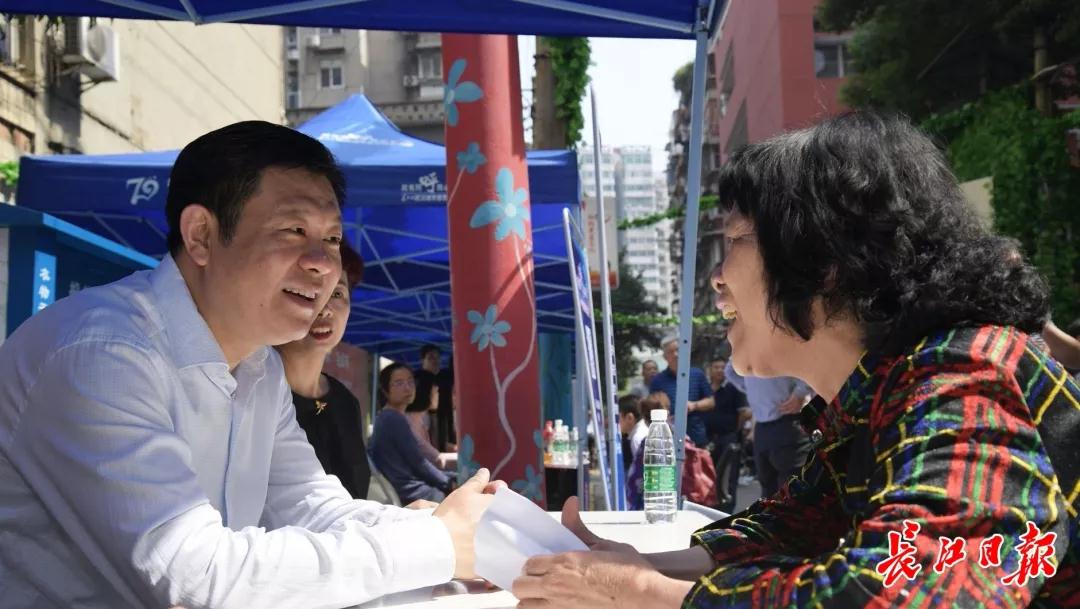 颁发完“金点子”奖,江汉区人民政府区长李湛在现场与群众面对面交流,答疑解惑解决问题,收集意见建议。