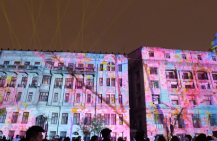 3月20日,2021“花Young武汉”樱·舞文创市集在江汉路步行街热闹开摊,当晚文创市集上演樱花主题光影秀。