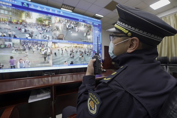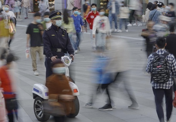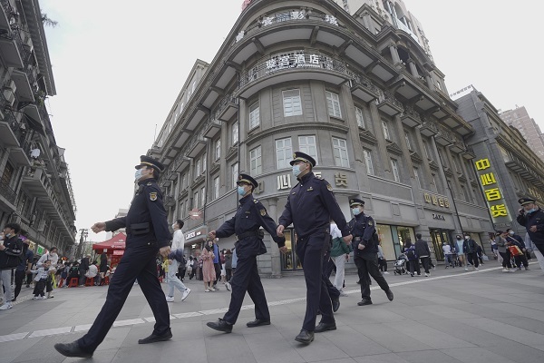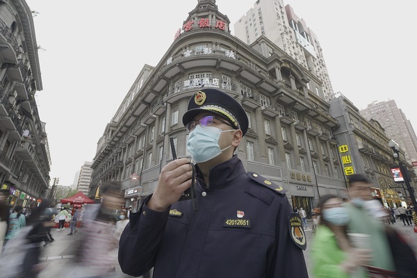4月10日,在江汉路步行街,城管巡逻队员迈着整齐的步伐,行走在川流不息的人群之中,每个路口都看到城管队员的蹲守。