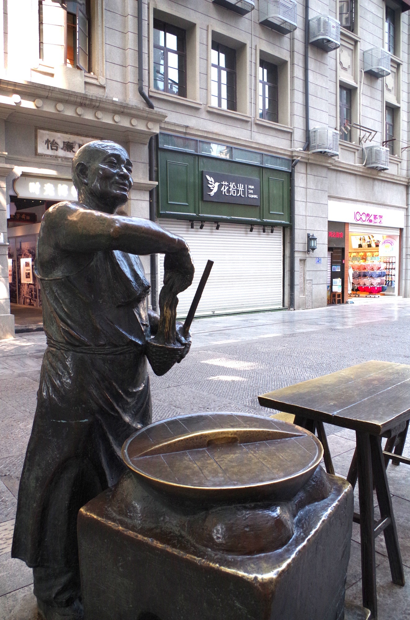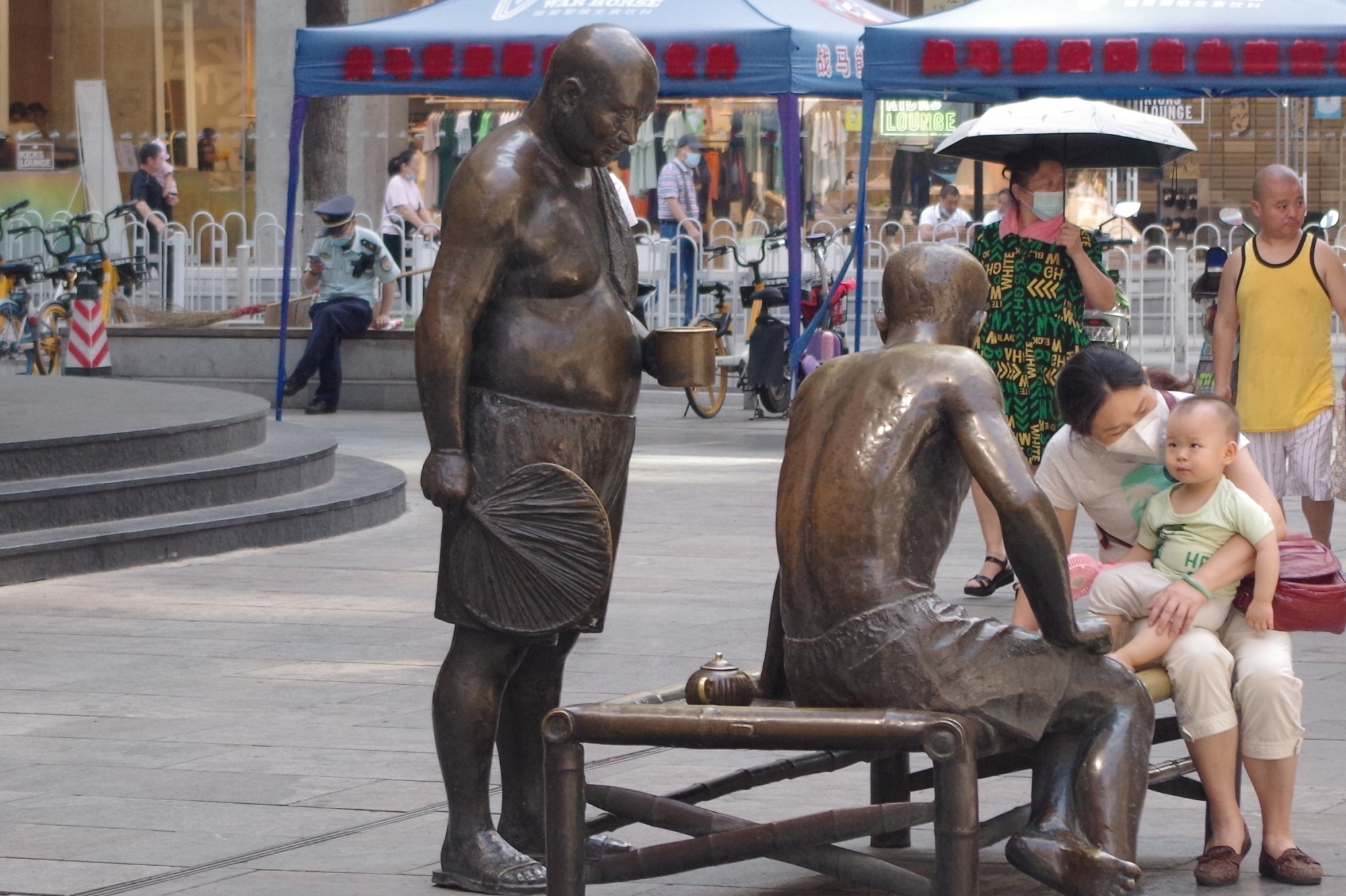但江汉路上的一组民俗铜像,则将老武汉的生活定格在这条繁华的商业街。