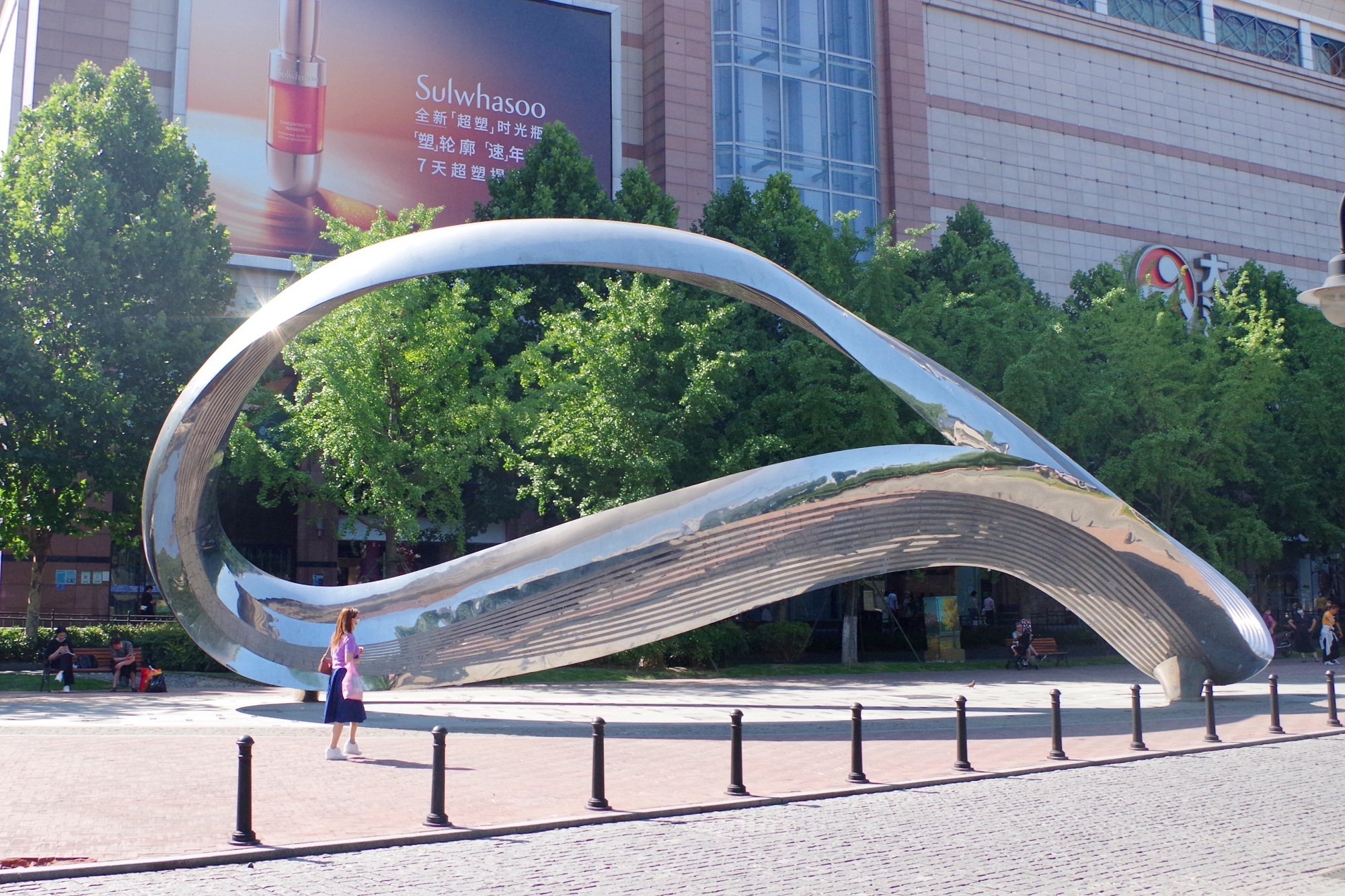 如今的《融》雕塑依旧熠熠生辉,简约的造型与周边现代化的商业环境相得益彰。