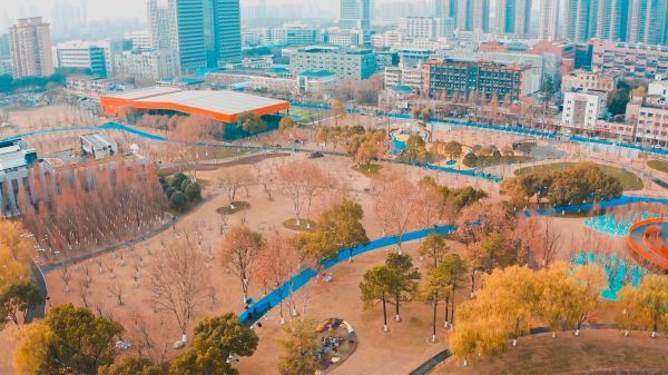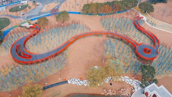 园内堆起了一座小山,亮橙色的钢材栈道,如丝带般绕山而建,拾级而上,可俯瞰全园,增加了高低错落的视野。眼下正值隆冬时节,小山新植的树木尚处养护期,暂未发芽,小树脚下,蓝色的幕布覆盖着新撒的野花草籽,连建辉说,只待春暖,这里将呈现一番花田野趣。此外,公园还有海棠园、紫薇花园、梅园、樱园等,四季有花开。