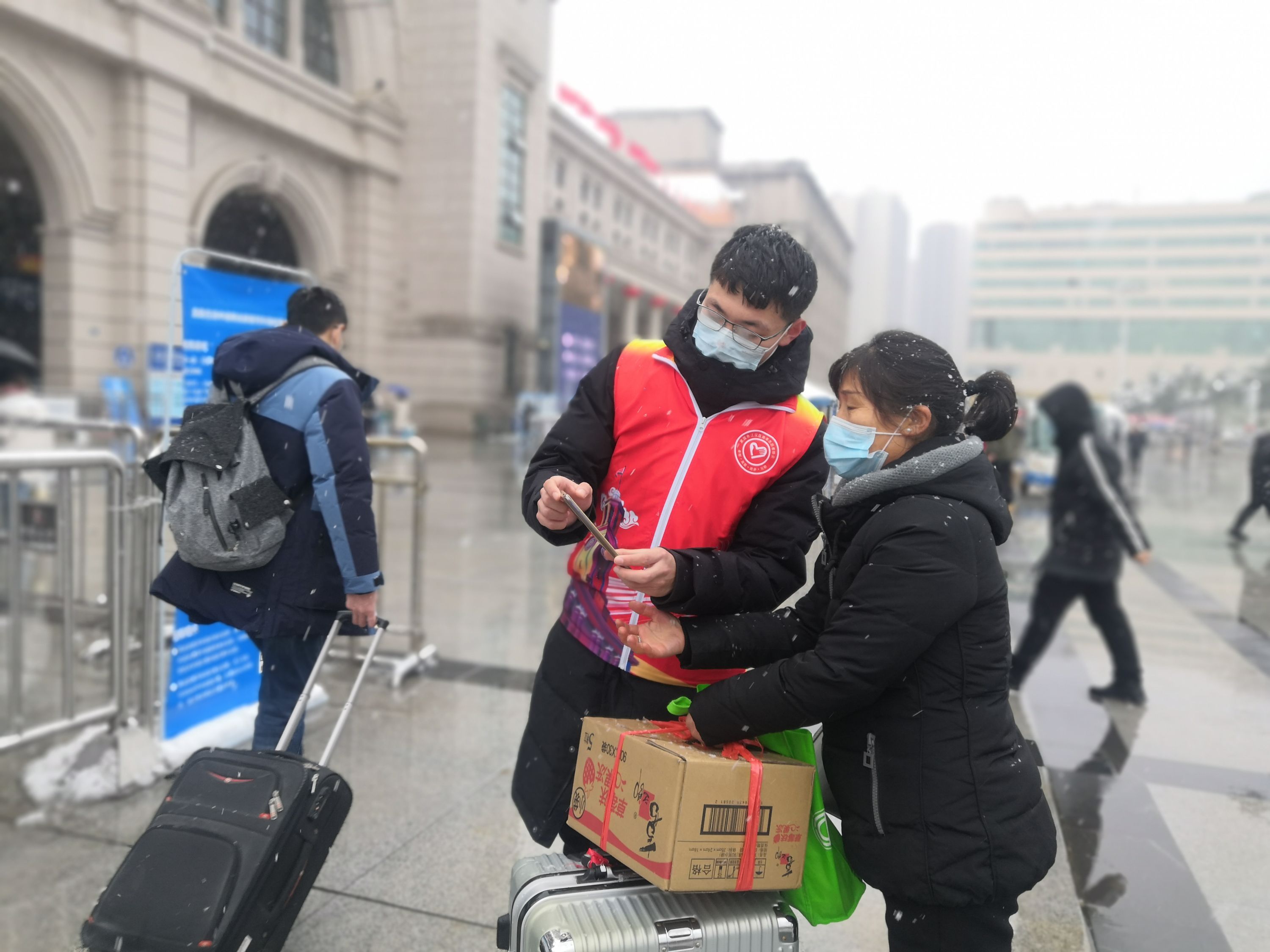 2月7日,武汉降落大雪,清晨8点不到,汉口火车站就迎来一群“红马甲”为过往旅客志愿服务,他们全部来自共青团江汉区委“党团先锋汉口火车站志愿服务队”,由在校大学生和社会志愿者组成。