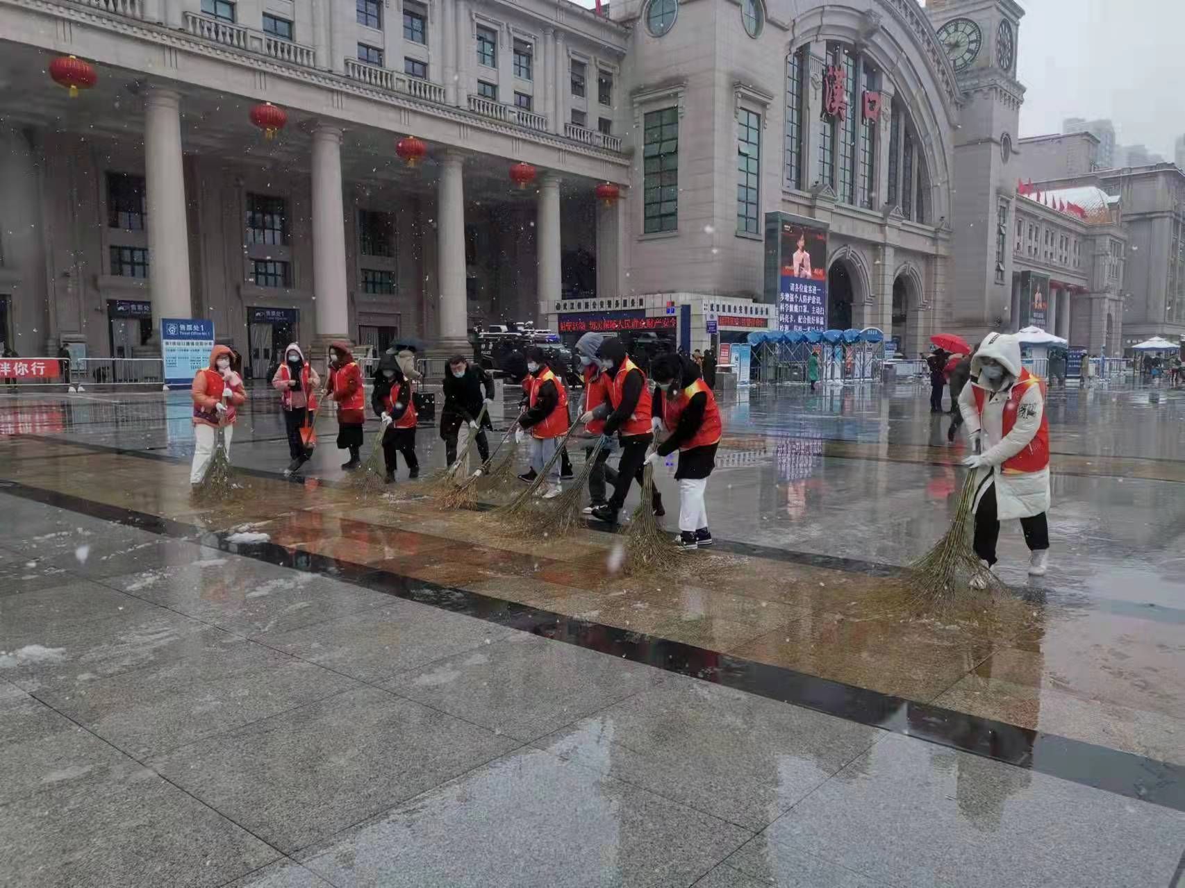 志愿者在汉口火车站广场扫雪。