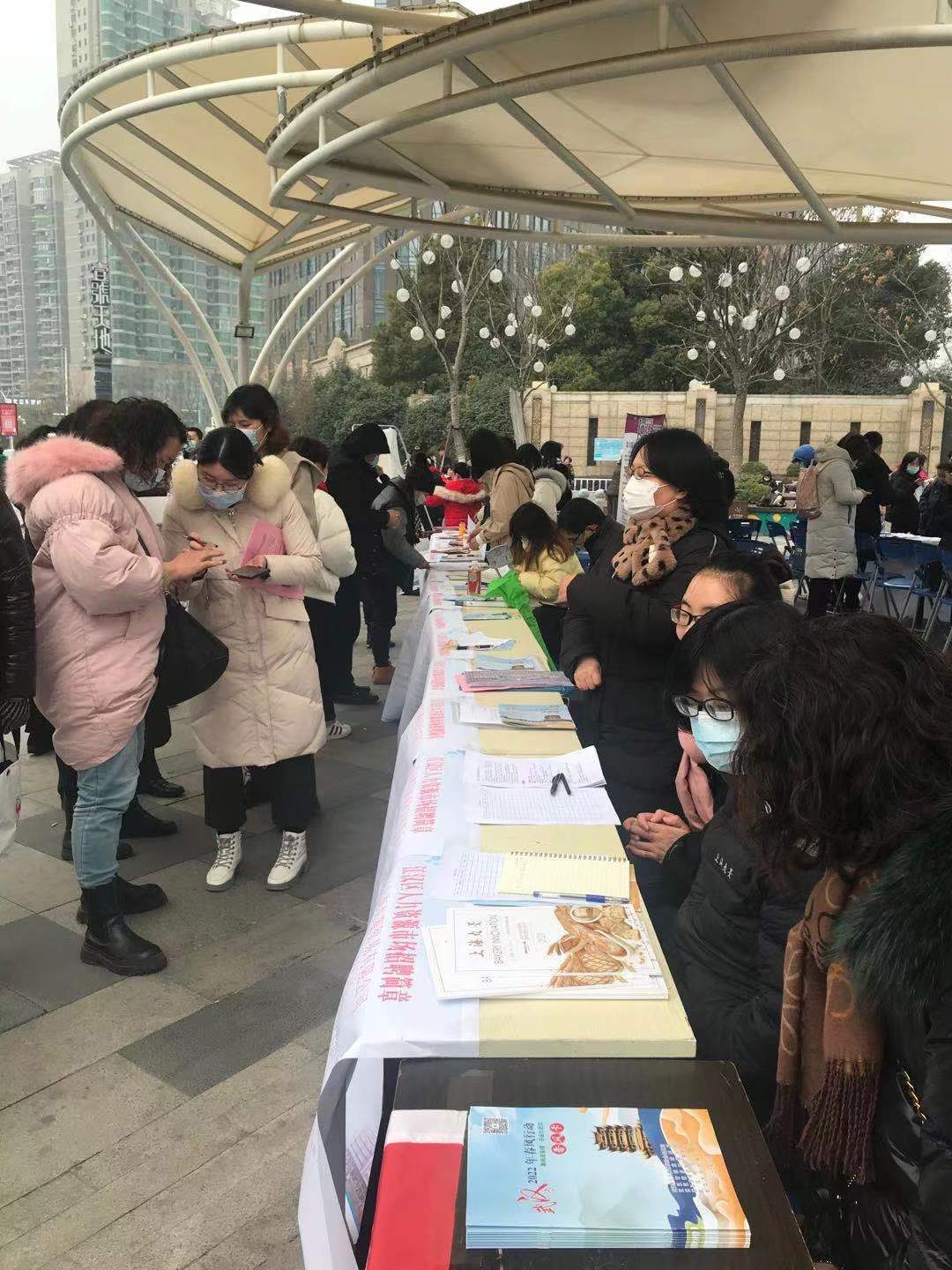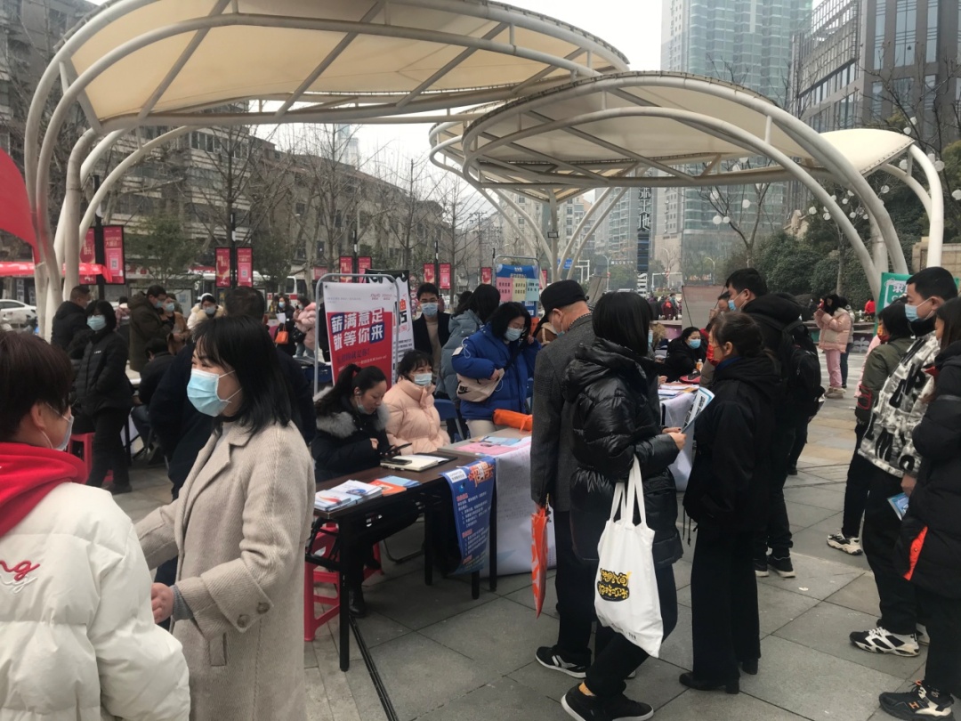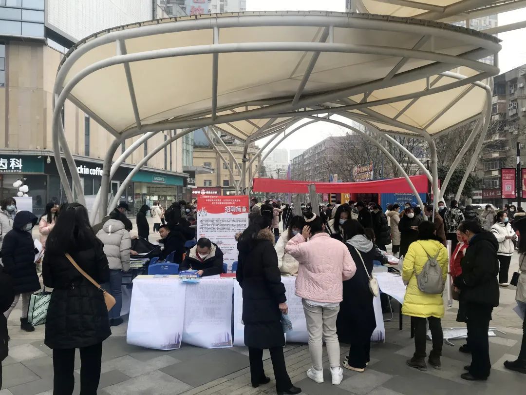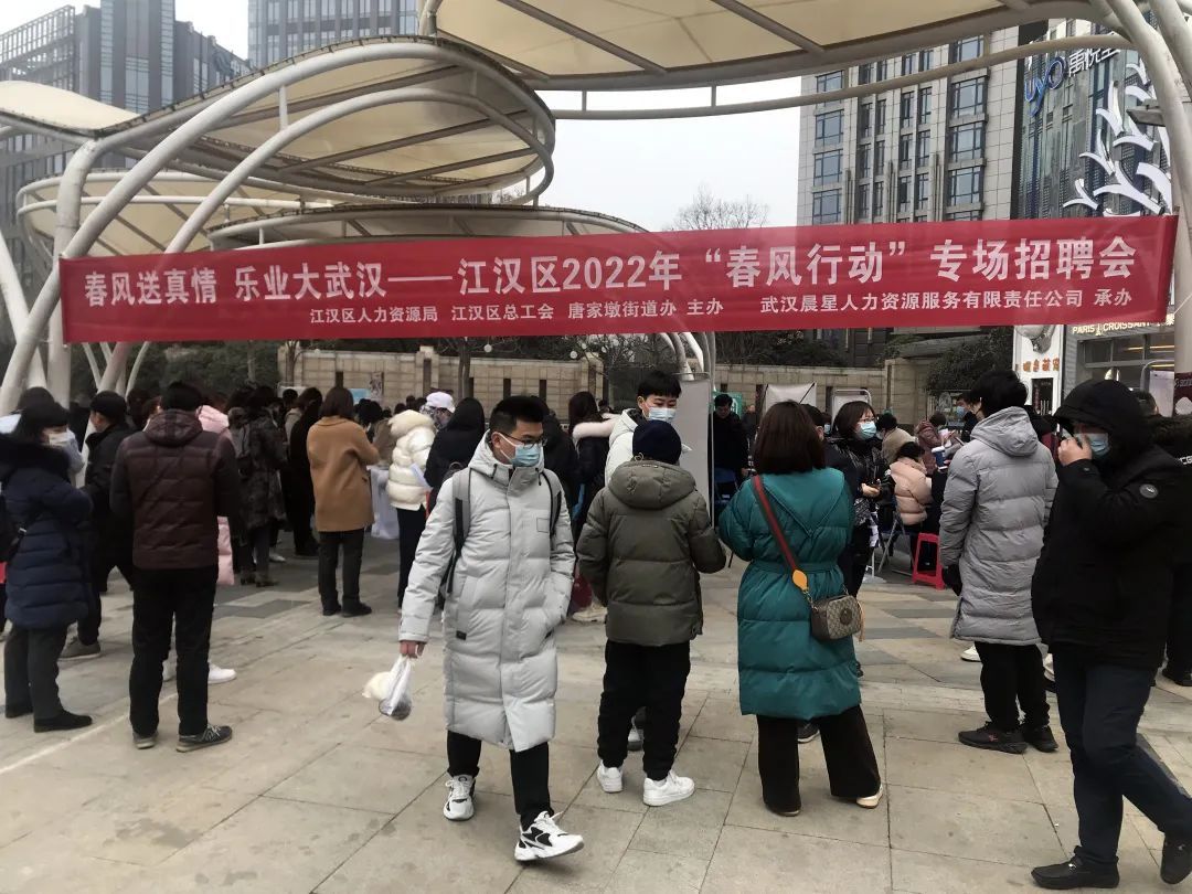 2月16日上午,由武汉市江汉区人资局、江汉区总工会和唐家墩街道主办的江汉区2022年“春风行动”首场线下招聘会于菱角湖壹号举行。