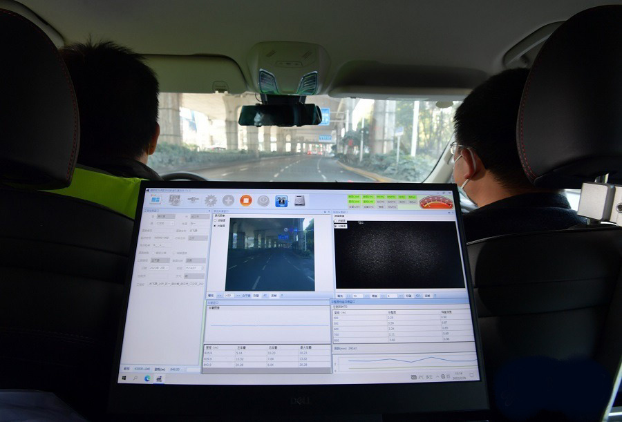 工作人员在三维雷达综合检测车内实时监测常青路。