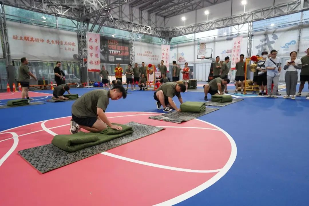 叠军被环节,参赛选手争分夺秒,认真细致,通过“折、切、捏、压、抠”等技巧的运用,一床床棱角分明、整齐划一的军被展现在大家眼前。