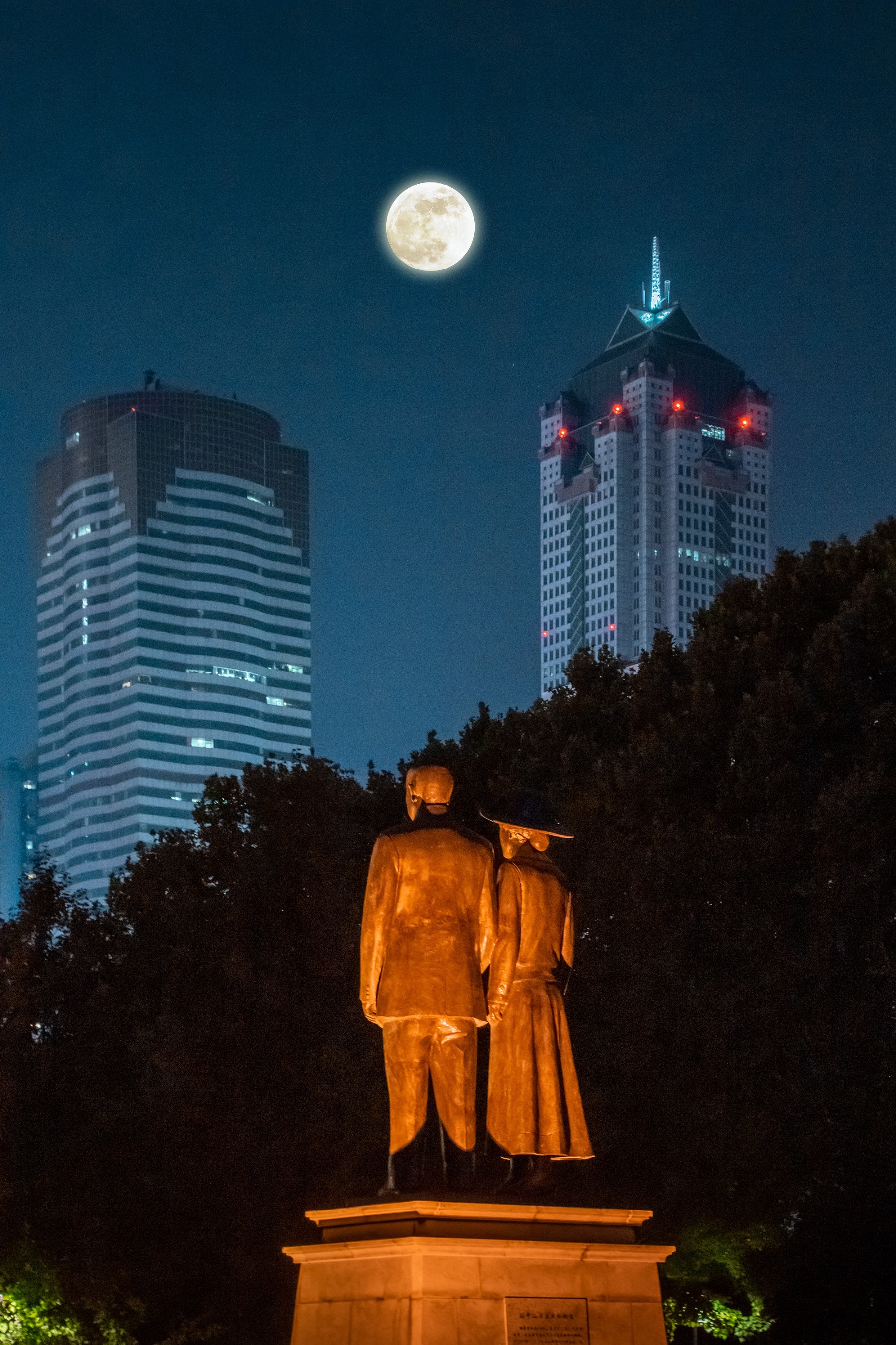 适逢月圆,月光、星空、江汉关码头与有趣的你相映成画,别有一番风味。