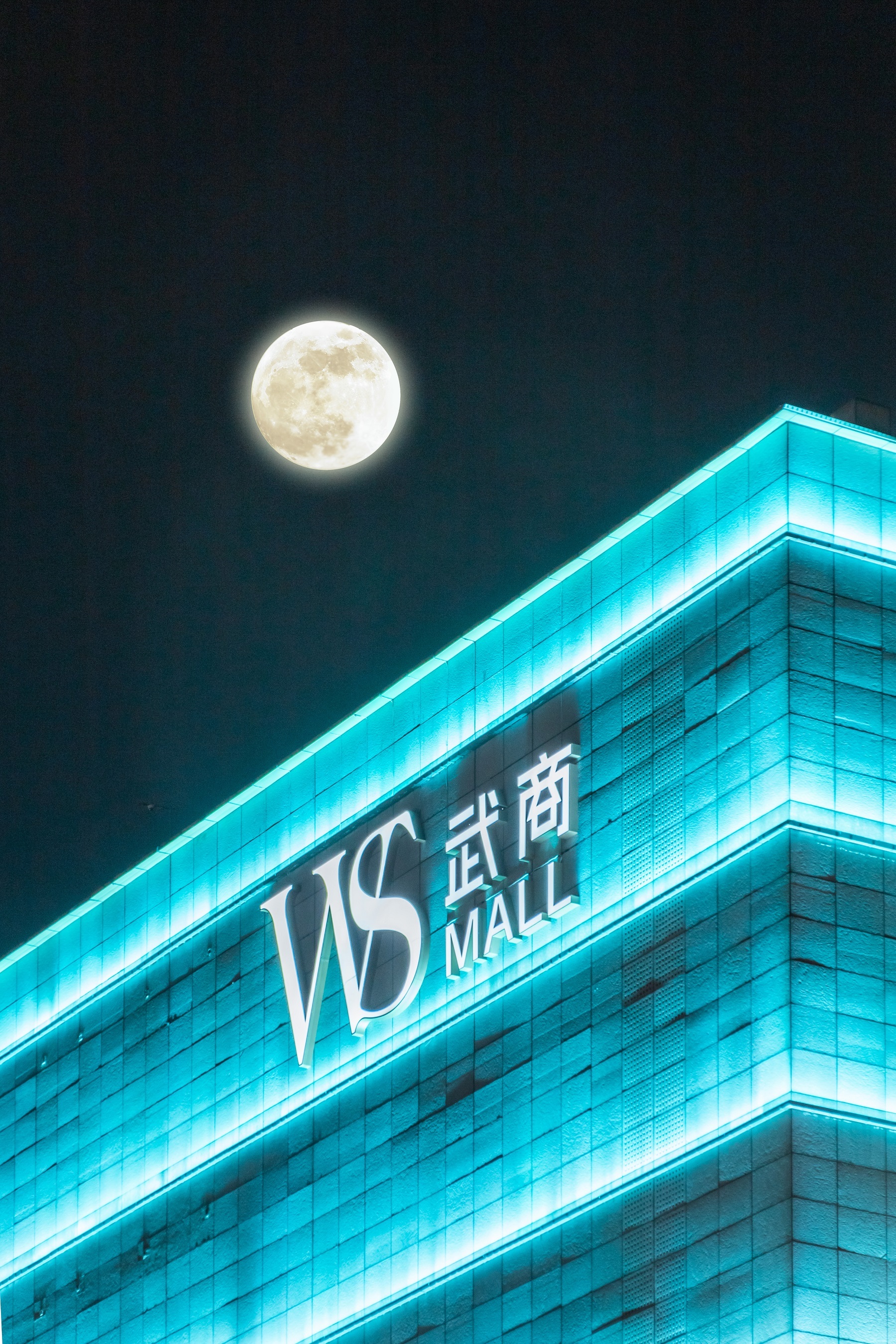 巨大的落地玻璃前,倒映着行人匆忙路过的身影,也映射着点点微亮的月色,来一组圆月大片简直再合适不过。