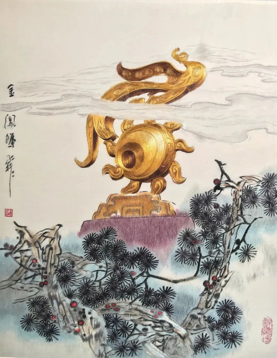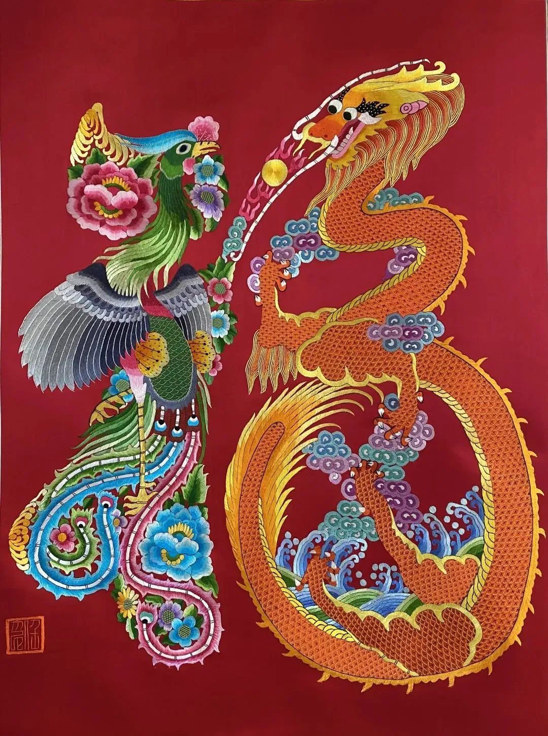 本作品由任炜于2004年6月完成,选用真丝缎作底料,真丝绣花线绣制。图案由龙、凤组成,龙和凤都是中华民族的标志和象征,龙为“鳞虫之长”,凤则是“百鸟之王”,是汉绣作品中极具代表性的题材,包含着对生活和谐美满的美好期许。整幅作品以齐平针为主,铺、压、勾、套、填等手法为辅,兼用滚针、钩针、刻鳞针等,以表现汉绣齐、平、顺的特点,极具装饰性及地域文化特色。本作品曾荣获中国(大连)轻工商品博览会“中轻万花杯”银奖。