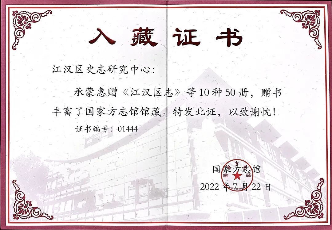 近日,武汉市江汉区档案馆(区史志研究中心)收到国家方志馆颁发的“入藏证书”,江汉区编纂的《江汉区志》、近年出版的《江汉年鉴》等10种50册志鉴书籍入藏国家方志馆。这是江汉区史志研究成果首次入藏国家方志馆,对展示江汉经济社会发展成果,传承江汉史志资料具有重要意义。
