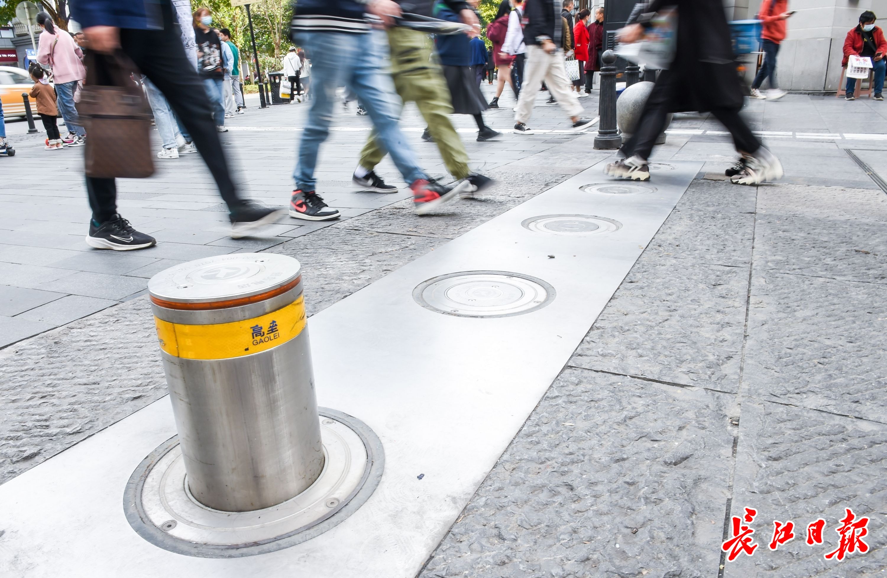 江汉路步行街上的电动升降桩,可实现远程控制升降。