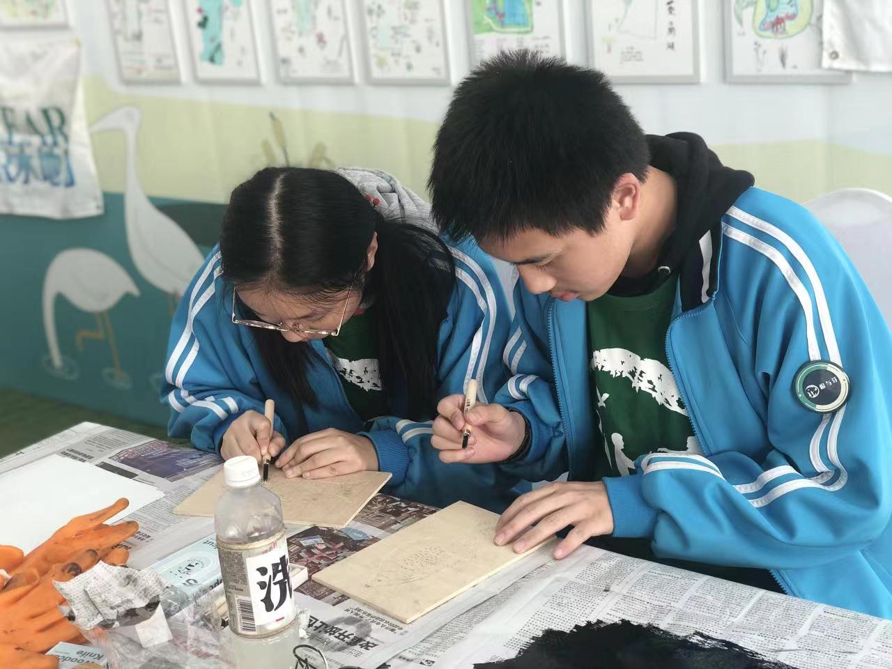 武汉市第十二中学学生制作鱼类版画全家福。