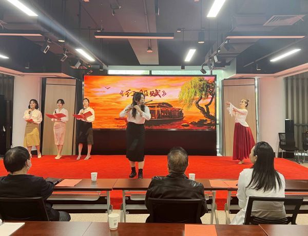 随后,悠扬的音乐响起,器乐合奏《快乐的女战士》和《我和我的祖国》、二胡独奏《荆楚花鼓韵》、弹拨乐合奏《高岗上》《站在高高的山岗上》、小提琴独奏《山丹丹花开红艳艳》……音乐与党课互相交融,现场观众在红色经典的曲目中感受一幕幕或悲壮激烈,或辉煌壮丽的党史画卷。在与音乐交流、与历史对话的同时,洗练初心灵魂,叩响使命担当。现场还不乏江汉区文旅局工作人员原创作品,融合诗、乐、舞三个元素的《红船赋》将党史融入文艺作品,引导党员在艺术欣赏中感受党史、了解党史、理解党史。全体党员共同起立,深情合唱《没有共产党就没有新中国》引发现场高潮,在音乐旋律中体验难忘的沉浸式音乐党课。
