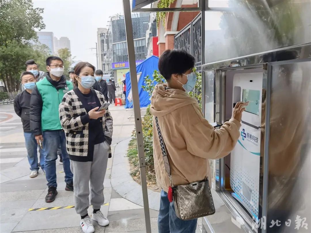 江汉里社区党群服务中心门口的核酸采样亭外,居民有序排队做核酸。与普通采样亭不同的是,亭中仅有一位采样人员,信息录入由一台自助机承担。