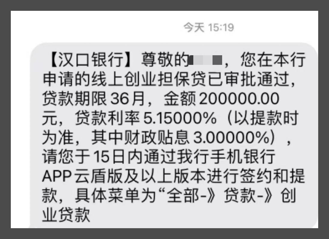 “您在本行申请的线上创业担保贷已审批通过,贷款期限36月,贷款利率5.15%(其中财政贴息3.00%)……”伴随着“叮咚!”声,武汉市江汉区创业青年95后胡先生收到了翘首以盼的短信,他感叹“这个创业贷太给力了,我从申请创业资格到银行放款都全部在手机上操作,政府还给了这么大力度的贴息,实在是既方便又实惠!”