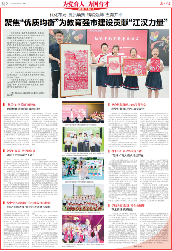 9月10日,第41个教师节到来之际,《长江日报》专版报道江汉教育:《优化布局 提质焕新 铸魂强师 五育并举 聚焦“优质均衡”为教育强市建设贡献“江汉力量”》。