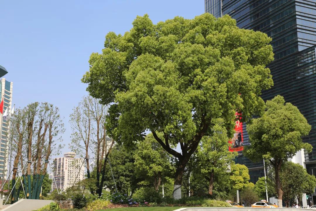 西北湖广场旁建设大道人行道绿植,每棵大树下都建起了小花坛。
