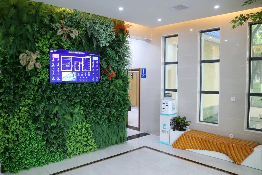 新建的两座公厕不仅外观洋气,内里还以绿植装饰墙面,悬挂了显示屏实时播放着入厕人数、蹲位显示、氨气、硫化氢监测等数据指标,感应洗手液、烘干机、取纸机、直饮水机等设施一应俱全。
