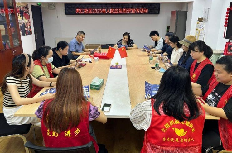 近日,在第23个全民国防教育日来临之际,江汉区民意街道天仁社区开展了天仁社区全民国防教育日人防应急知识宣传系列活动。组织武汉农业集团股权公司、武汉市江汉房屋置换有限责任公司、江汉区稚美幼儿园、3家结对单位和社区居民骨干志愿者开展人防应急知识宣讲培训,社区书记秦才杰用通俗易懂的演讲方式,为3家结对单位和社区居民志愿者详细讲解人民防空有关基本内容和防空防灾知识,普及基本逃生手段和防护措施。网格员们现场播放音频为大家演示了不同防空警报的鸣响方式,并一一解答了大家提出的问题,开展了人防知识答题,并为社区志愿者们发放了应急包。3家结对单位和社区居民志愿者和社区工作人员一起开展了普及人防知识走访宣传活动,通过入户宣传、发放宣传单等方式向社区居民们宣讲防空防灾应急知识,现场与居民朋友们进行互动,通过讲故事、提问等形式调动起居民们学习的积极性,向居民普及人防工程的重要性,大力提升宣传覆盖力度。
