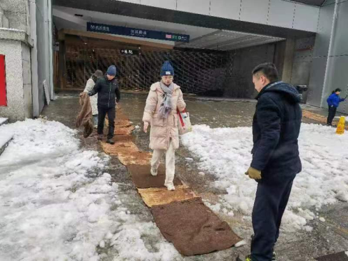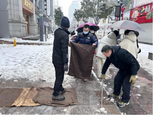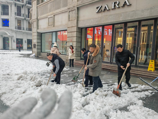 此外,江汉路步行街区综合服务中心注重发挥街区共建共治合力,向街区商户发布扫雪除冰志愿服务活动倡议书,号召商家认真履行好“门前三包”责任制,主动清理门前积雪,鼓励商户积极投身扫雪除冰行动,为街区道路安全畅通尽分内之责。街区中心百货、X118、三联书店等商户及物业及时组织员工参与积雪清理行动。