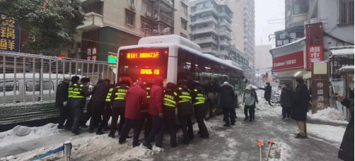 早上7:40左右,一辆801公交车行至江汉二路江岸区域附近,陷入路面泥坑不能动弹,造成后方车辆堵塞,车上乘客下车求援,街区扫雪除冰队伍放下工具、迅速集结,伴随着富有节奏的“一、二、三”,形成强大合力,经过十多分钟努力,成功推动公交车顺利前行,恢复了道路畅通。护行队伍完成了这支“合唱”插曲,又迅速回到扫雪岗位继续工作。