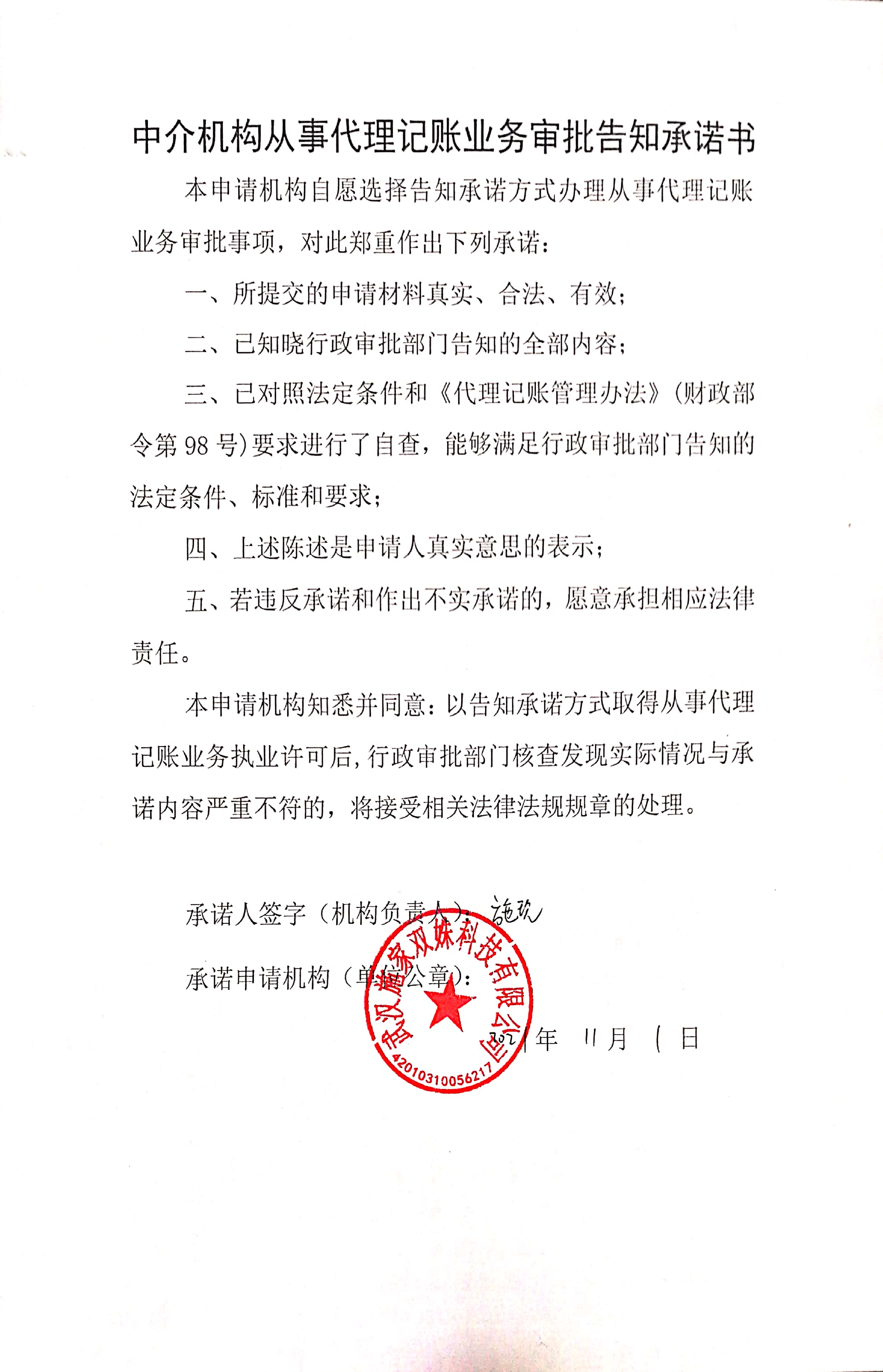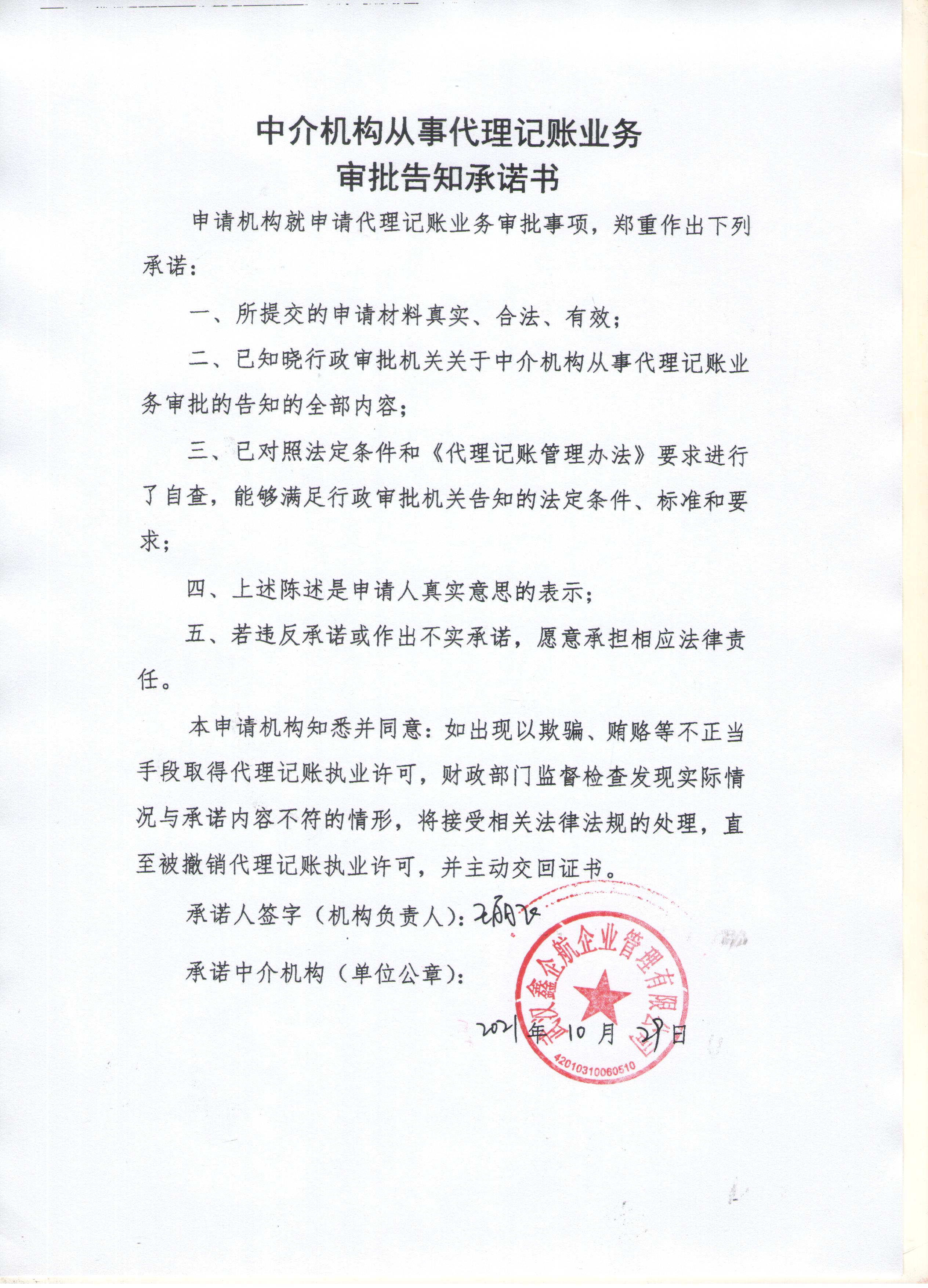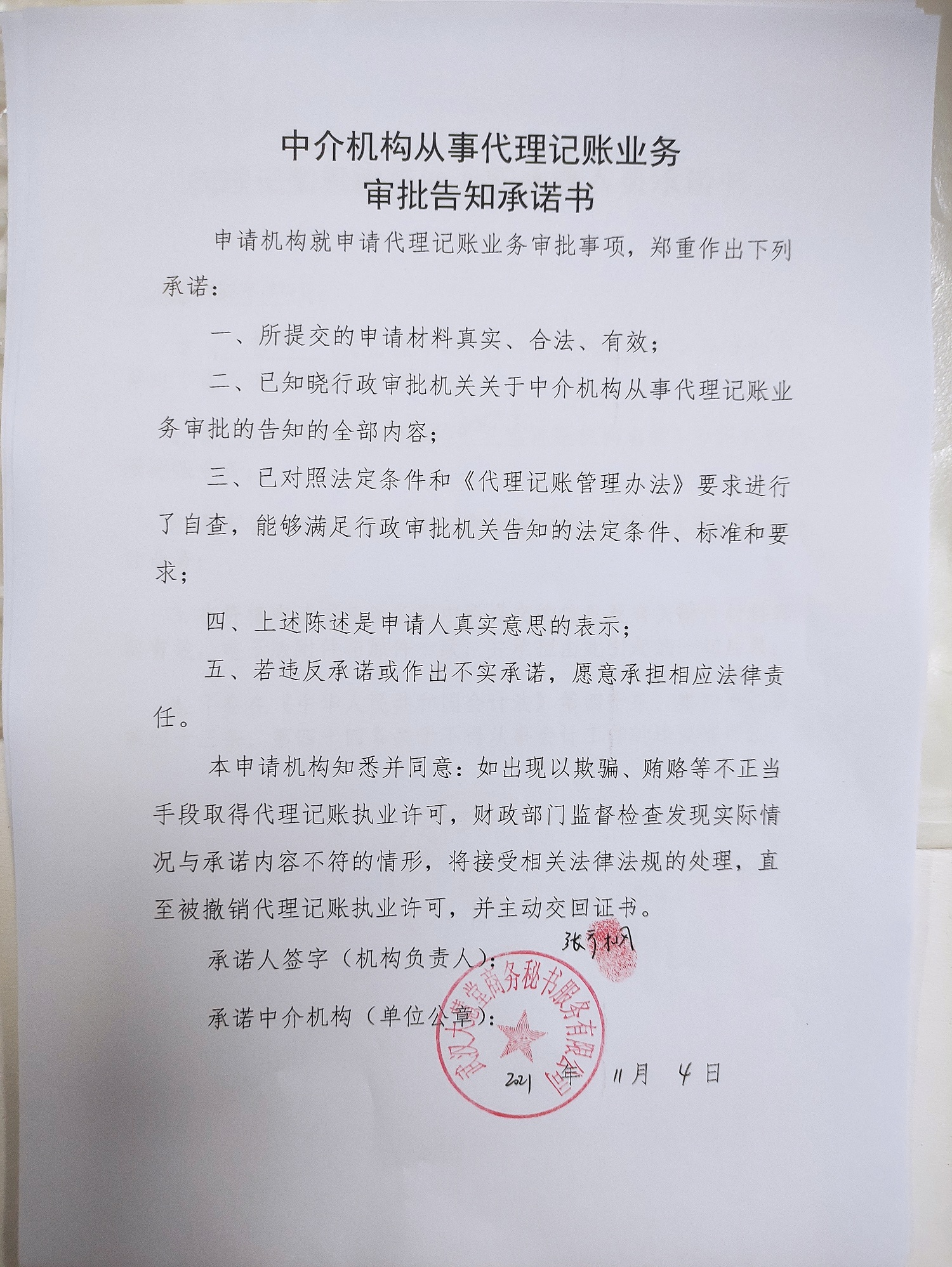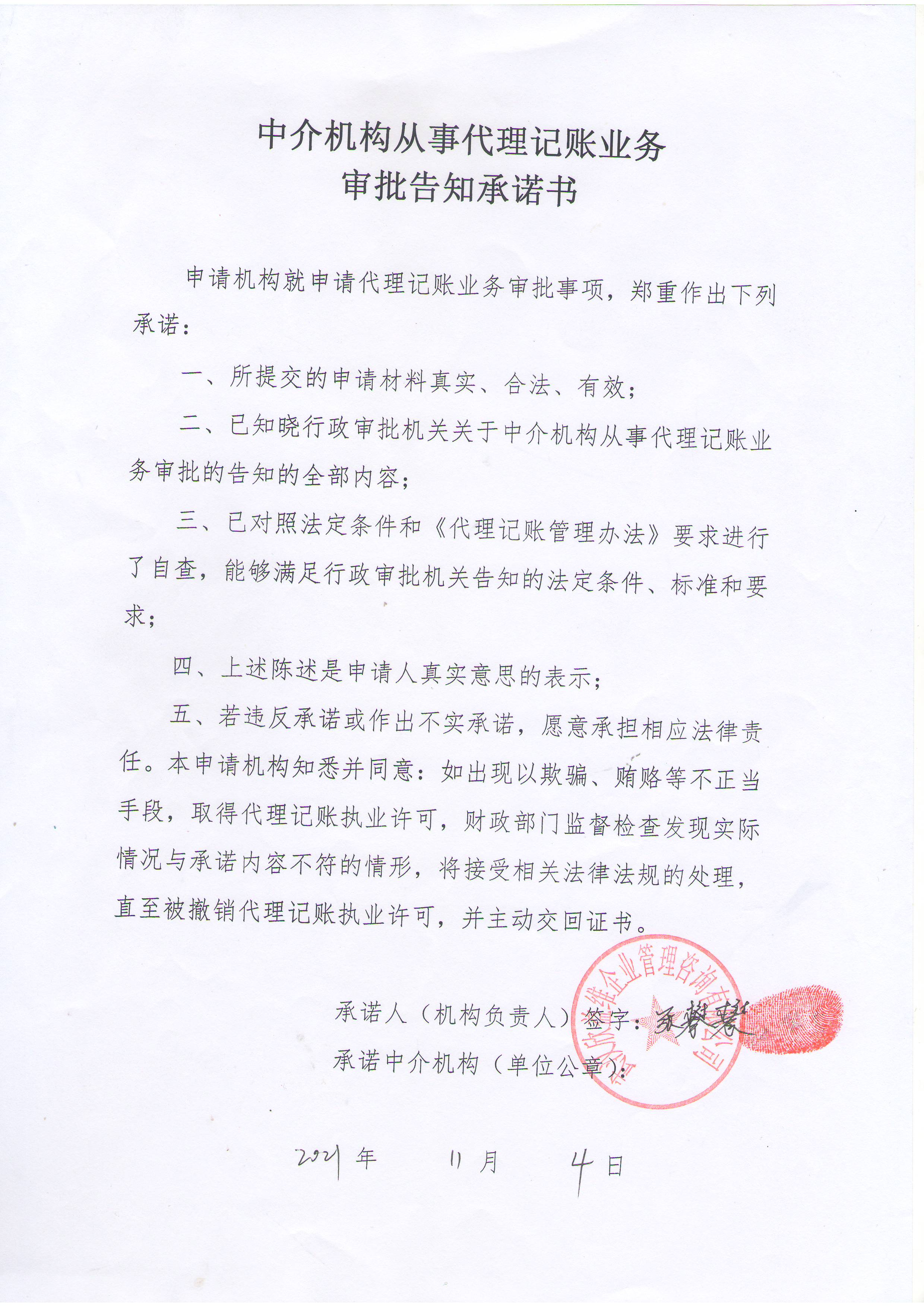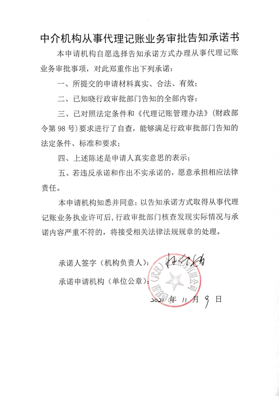 根据湖北省财政厅《关于会计行业行政审批实行告知承诺方式的通知》(鄂财会发〔2021〕8号)要求,现将武汉施家双姝科技有限公司、武汉鑫企航企业管理有限公司、武汉大慧堂商务秘书服务有限公司、中创联服(武汉)企业管理有限公司、武汉欣益维企业管理咨询有限公司共5家《中介机构从事代理记账业务审批告知承诺书》予以公示,接受社会监督。