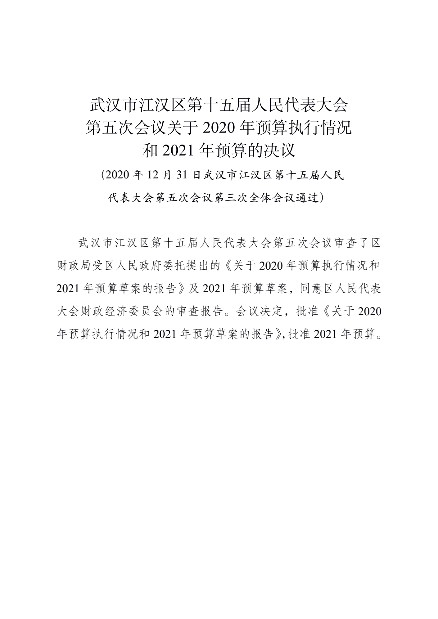 | 标 题 | 武汉市江汉区第十五届人民代表大会第五次会议关于2020年预算执行情况和2021年预算的决议 | ||