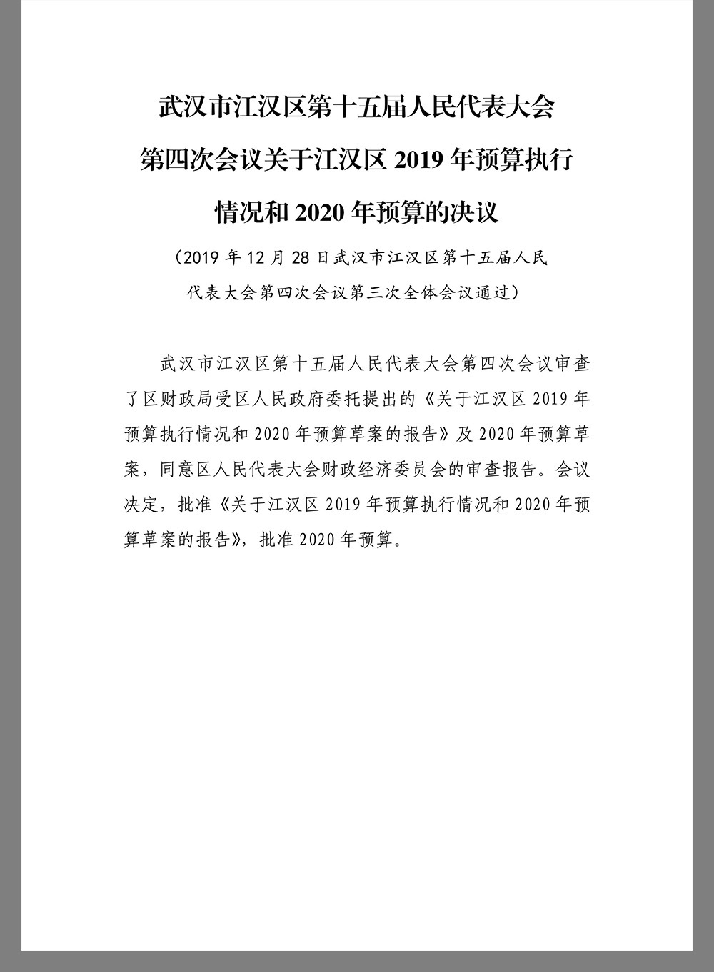 | 标 题 | 武汉市江汉区第十五届人民代表大会第四次会议关于江汉区2019年预算执行情况和2020年预算的决议 | ||