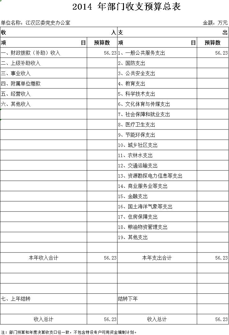 2014年部门预算总收入56.23万元。其中:财政拨款(补助)收入56.23万元,事业收入0万元,上级补助收入0万元,附属单位上缴收入0万元,事业单位经营收入0万元,其他收入0万元,上年结转0万元。