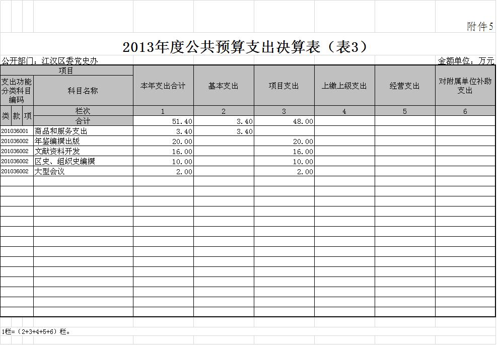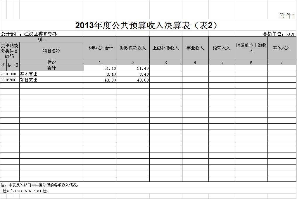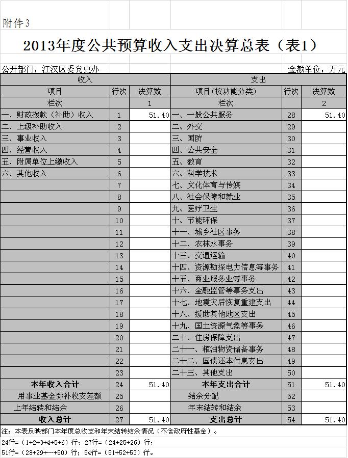 武汉市江汉区委党史办2013年收入总计51.40万元,无上年结转和结余,均为财政拨款;支出总计51.40万元。