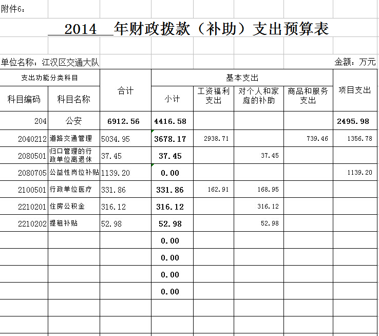 | 标 题 | 2014年江汉区交通大队财政拨款(补助)支出预算表 | ||